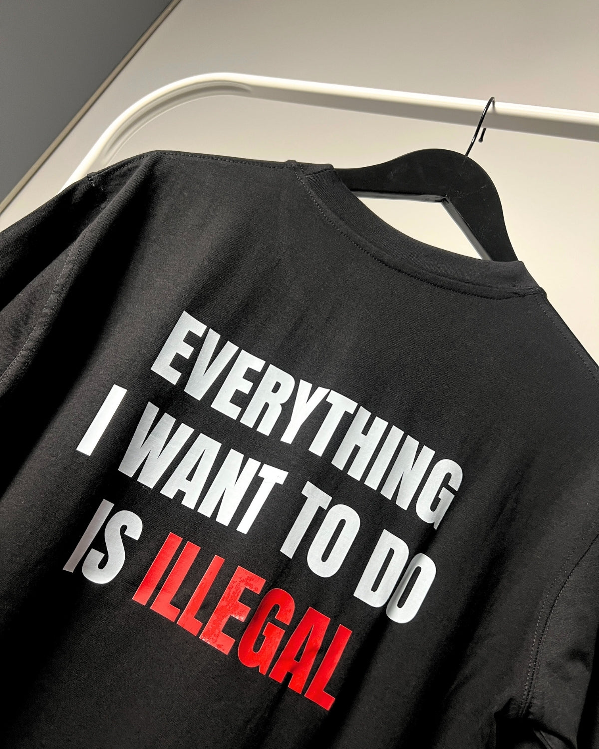 “ILLEGAL” - graphic is embedded using a state of the art direct-to-film technology in a 220 GSM 100% Cotton Fabric.Comes in an all new Classic V2 with CROPPED LENGTH.