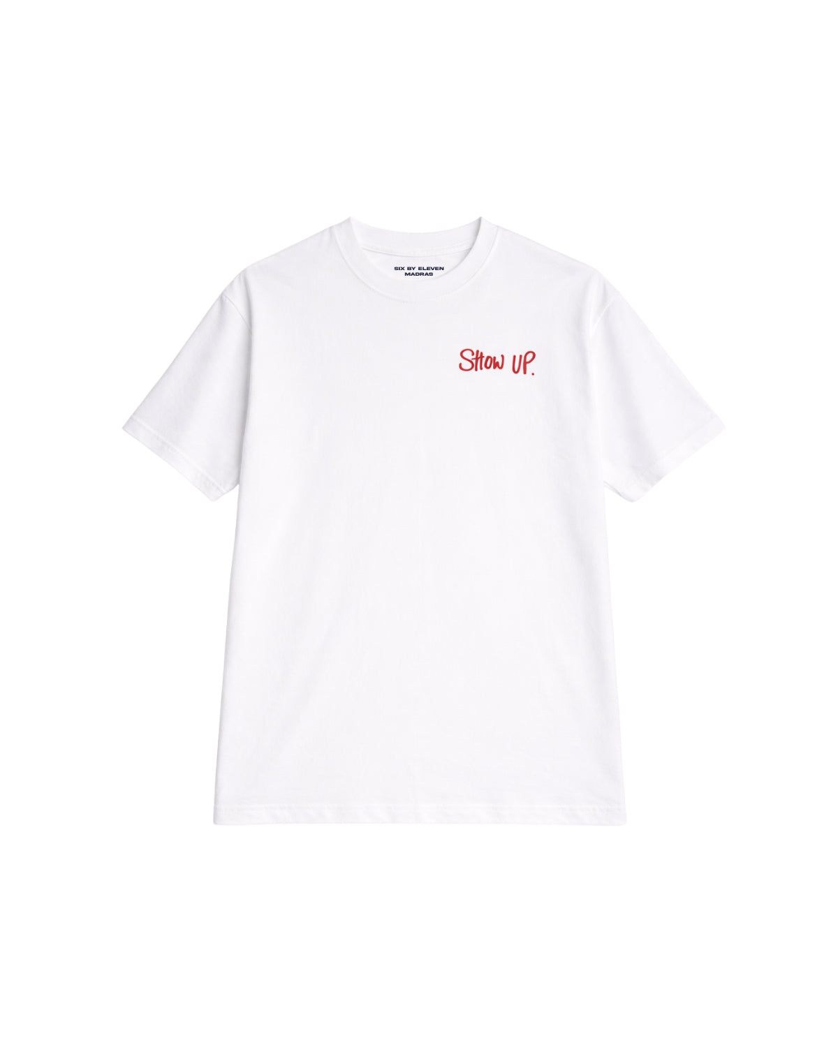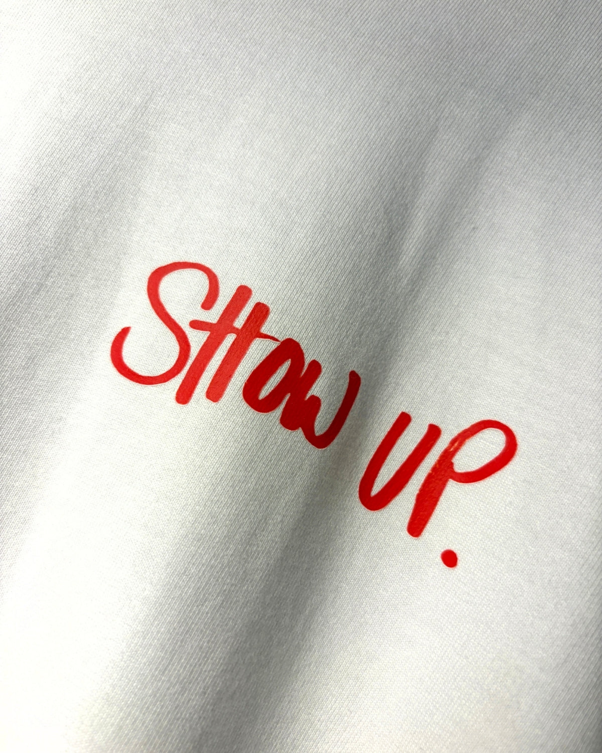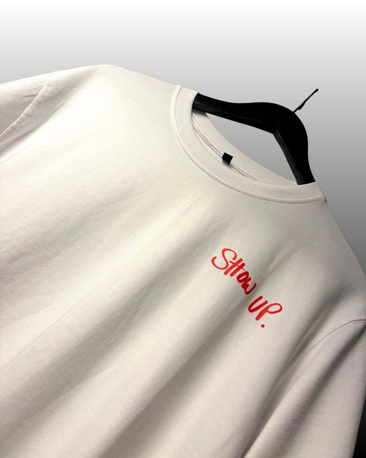 'SHOW UP' - The graphic is embedded using a state of the art direct-to-film technology in a 240 GSM Premium French Terry Fabric. Comes in an all new Classic V2 fit which is the same as the regular Classic Oversized Tees but slightly cropped in length.