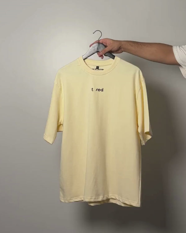 “TIRED” - graphic is embedded using a state of the art direct-to-film technology in a Butter Yellow 240 GSM 100% Cotton Fabric. Comes in an all new Classic V2 fit which is the same as the regular Classic Oversized Tees but slightly cropped in length.